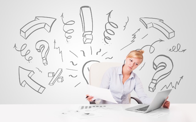 Attractive businesswoman brainstorming with drawn arrows and symbols